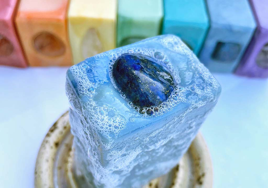 Balance your energy with our colorful Chakra Collection. Made with vibrant colors and custom essential oil blends, this collection will bring balance and awaken your senses. Our chakra soap bars are topped with a keepsake gemstone and come with a correlating mantra card.